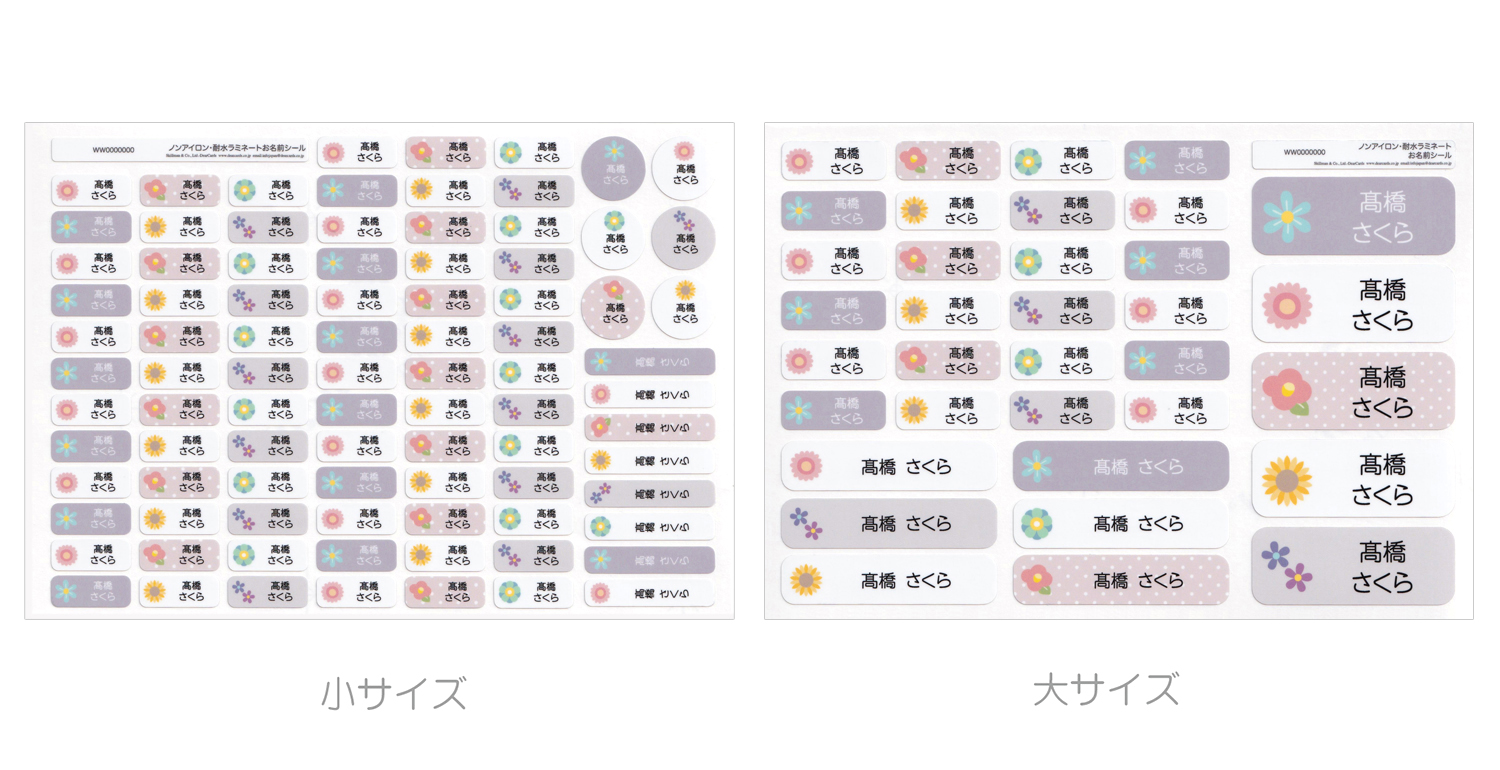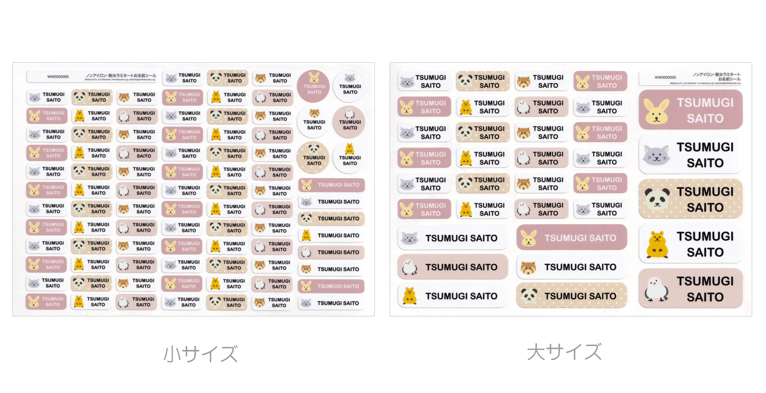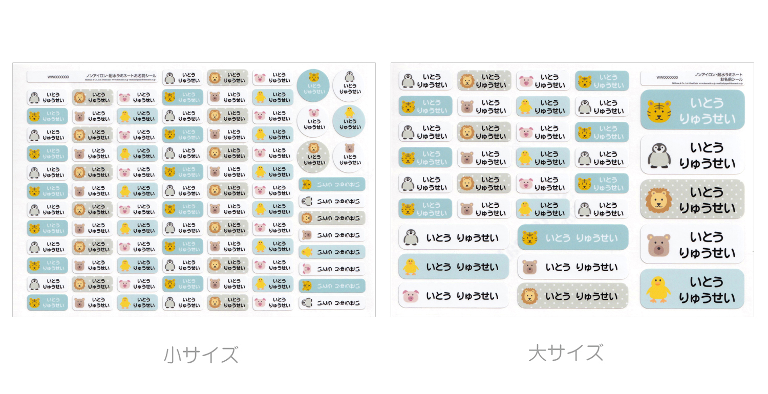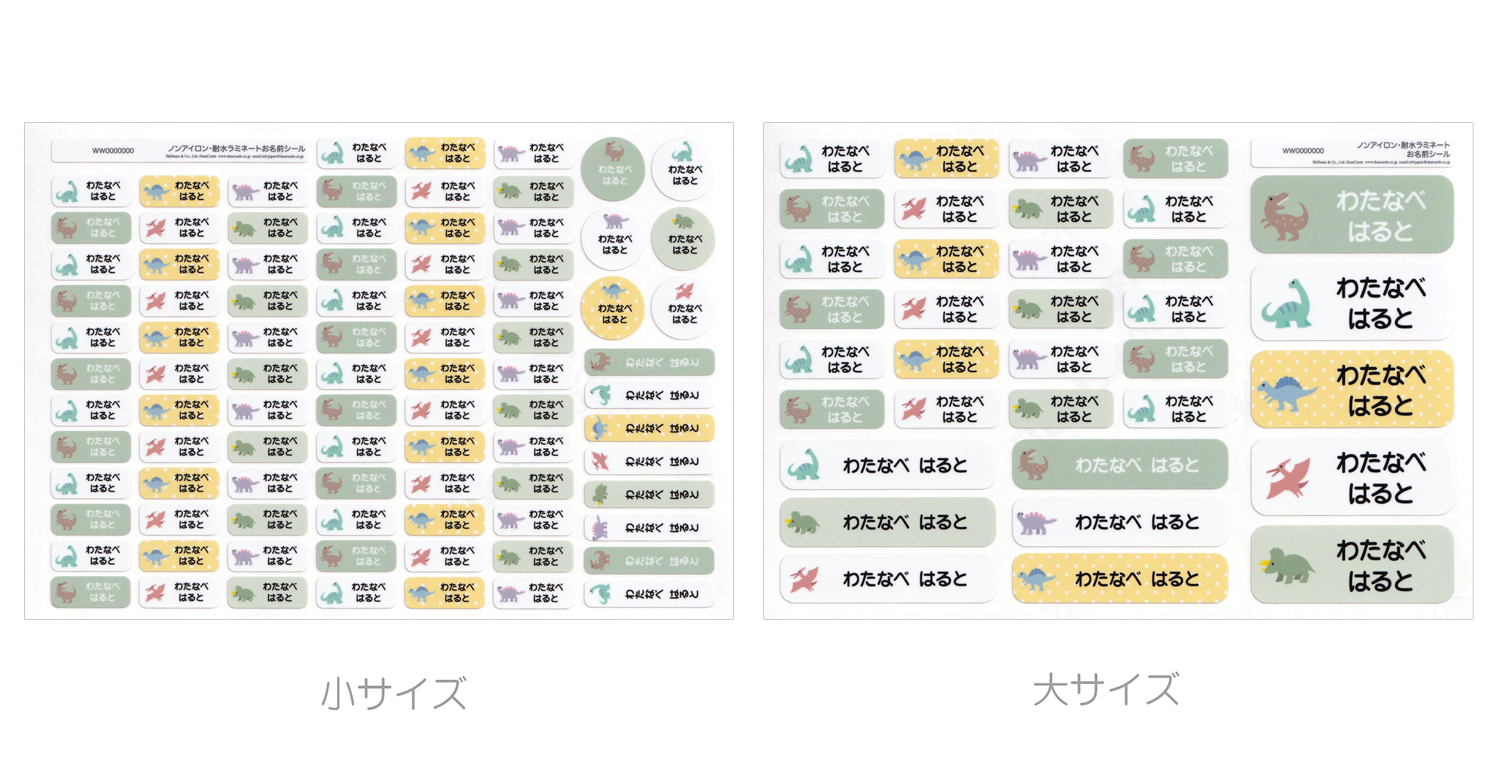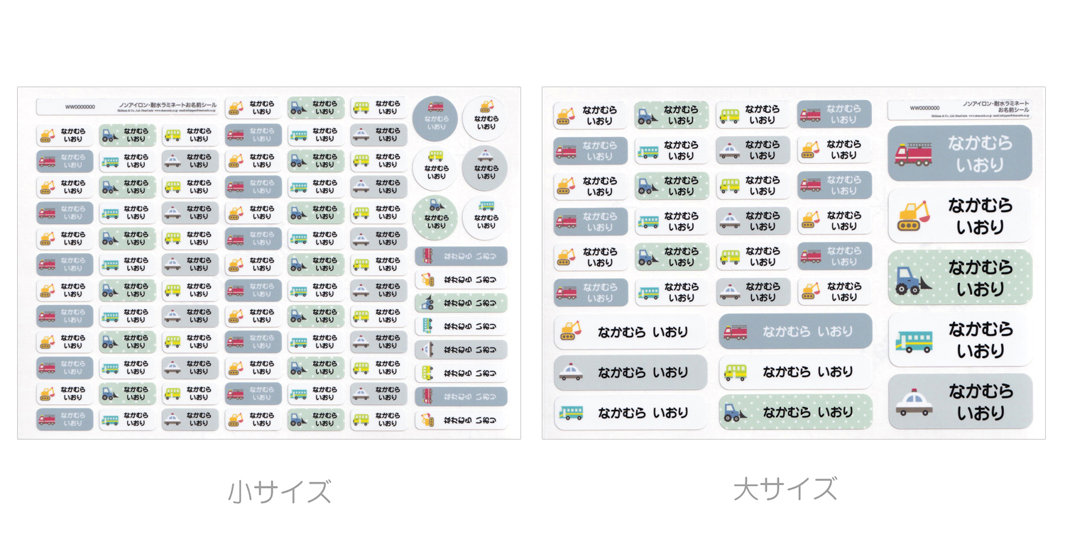ディアカーズ人気のノンアイロン・耐水ラミネートお名前シールは使用用途に応じて、小サイズ・大サイズから選べます。