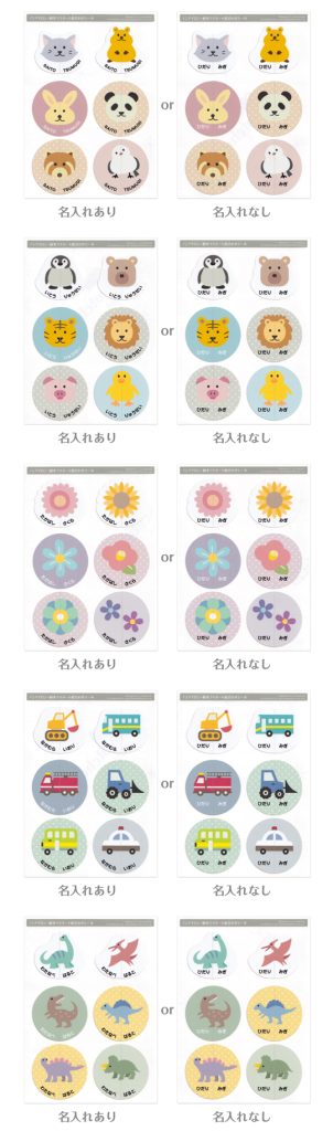 かわいくてすこし大人っぽい雰囲気のくすみカラー。ダイナソー・フラワー・はたらくくるま・どうぶつピンク・どうぶつブルー の5デザイン。名入れあり/なしから選べます。